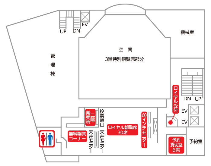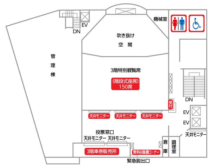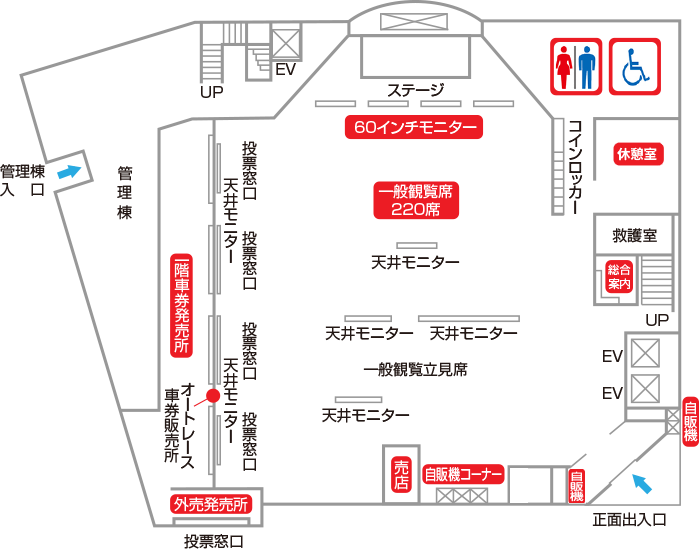 ▶︎60インチモニター ▶︎総合案内▶︎一般観覧席 ▶︎車券発売窓口 ▶︎自販機コーナー